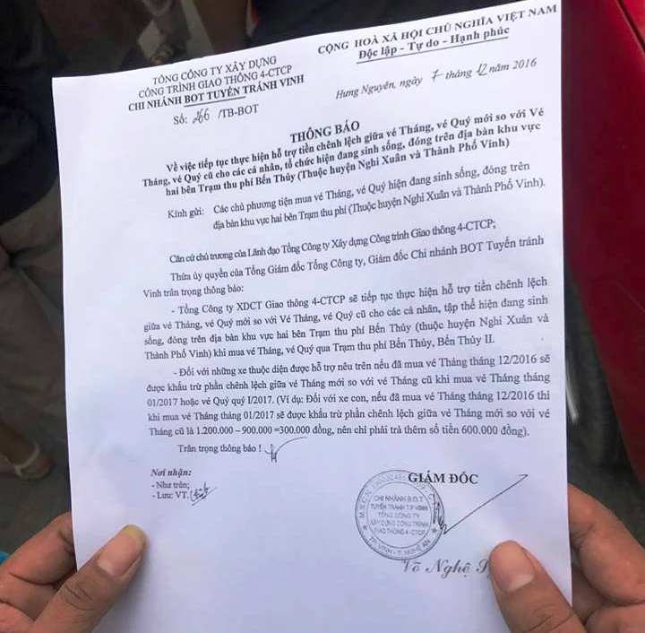 Công văn thông báo hỗ trợ vé tháng, vé quý cho người dân ở huyện Nghi Xuân (Hà Tĩnh), TP Vinh (Nghệ An) của chủ đầu tư tuyến BOT.