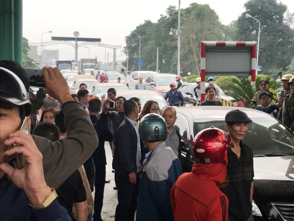 Người dân mang ô tô phản đối thu phí ở Trạm thu phí Bến Thủy 1.