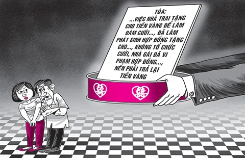 Theo tòa, mặc dù bên ông C. và chị N. nói chỉ đình đám cưới tạm thời nhưng bên ông C. và chị N. vẫn không có động thái gì để tiếp tục tiến hành làm đám cưới với con trai ông Ch. Như vậy, chị N. đã chính thức từ chối tiến hành đám cưới, có nghĩa là chị N. đã đơn phương chấm dứt hợp đồng tặng cho có điều kiện. Do bên ông C. và chị N. đã không tổ chức đám cưới như dự định nên việc ông Ch. khởi kiện yêu cầu trả lại số tiền, vàng đã cho là phù hợp với quy định của pháp luật. Từ đó, tòa tuyên buộc phía nhà gái phải trả tiền, vàng cho phía nhà trai.