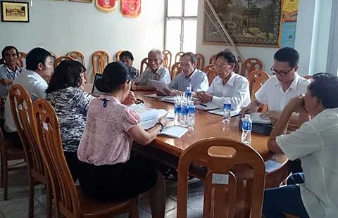 Đại diện TAND tỉnh Bình Thuận đang thương lượng mức bồi thường với “người tù thế kỷ” Huỳnh Văn Nén (góc trái) trong ngày 31-8. Ảnh: PHƯƠNG NAM