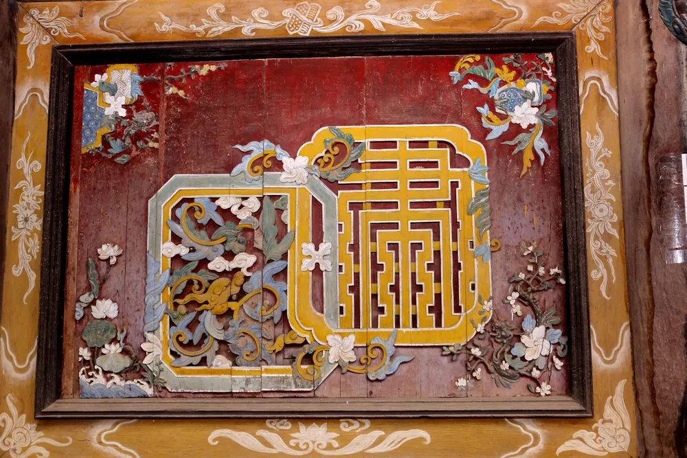 Những mảng chạm khắc nghệ thuật hoa lá rất tỉ mỉ trước cửa Nghè Nguyệt Viên. Ảnh: ĐẶNG TRUNG