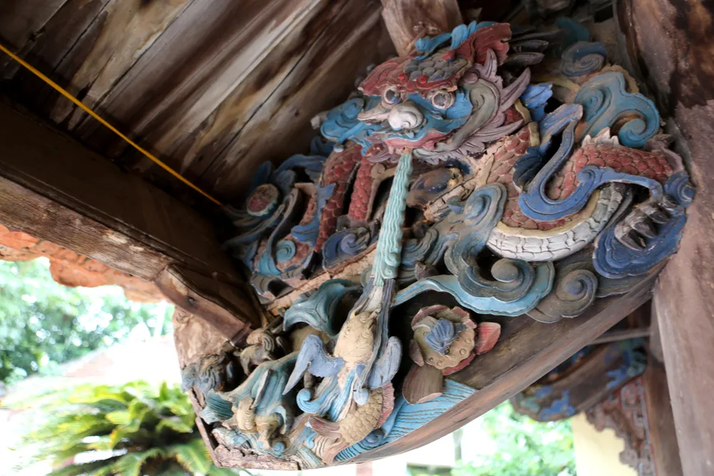 Nghè Nguyệt Viên có cấu trúc một gian hai chái, bố cục gần giống hình vuông, kết cấu kèo khá đặc biệt bao gồm những mảng chạm khắc nghệ thuật các linh vật chỉn chu đến từng chi tiết. Ảnh: ĐẶNG TRUNG