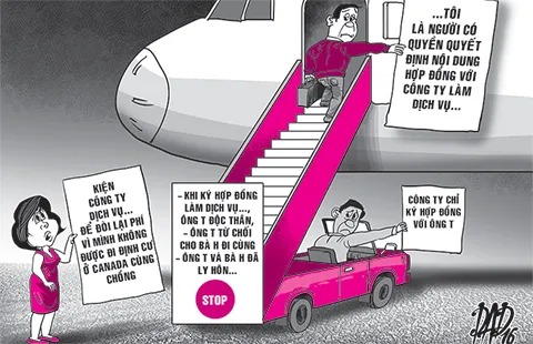 Ngoài hợp đồng chính do chồng bà đại diện gia đình ký với công ty, bà còn trực tiếp ký một phụ lục hợp đồng cùng ngày để thanh toán phí dịch vụ hợp đồng chính. Tổng số tiền mà bà trực tiếp ký cho công ty (con số mà bà kiện đòi) có chứng từ ký nhận. “Trong suốt quá trình thực hiện hợp đồng, tôi không hề được công ty thông báo diễn biến vụ việc. Mãi đến tháng 3-2012, bất ngờ chồng tôi đã xuất cảnh sang Canada mà danh sách không có tôi đi cùng. Trong khi tôi đã cung cấp hồ sơ cá nhân chung với chồng cho công ty theo hợp đồng đã ký. Tiếp đó, tôi đã cùng luật sư liên hệ công ty tìm hiểu thì được giải đáp là công ty chỉ ký hợp đồng với chồng tôi là ông T. Tôi không đủ tư cách pháp lý để giải quyết những vấn đề liên quan đến hợp đồng” - bà H. khai.