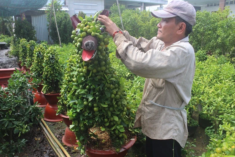 Hộ anh Trần Văn Trưởng ở ấp Vĩnh Chính (xã Vĩnh Thành, huyện Chợ Lách) đã có 20 năm kinh nghiệm trong sản xuất kiểng thú linh vật của năm. Tết Mậu Tuất năm nay, anh Trưởng dự định sẽ sản xuất 150 con kiểng tắc hình “chú chó” với đủ kiểu dáng có kích thước từ 1-2,2m để bán cho khách hàng.
