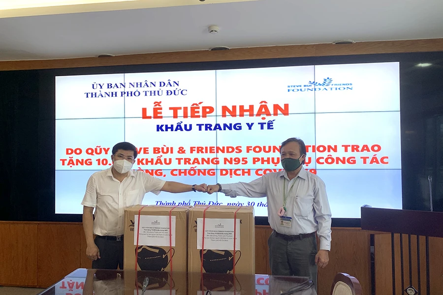 Ông Phùng Công Dũng, Chủ nhiệm Ủy ban về người Việt ở nước ngoài TP.HCM (bên phải) tiếp nhận quà tặng từ Quỹ Steve Bùi và những người bạn ở Nhật Bản, hôm 30-7. Ảnh: L.THOA