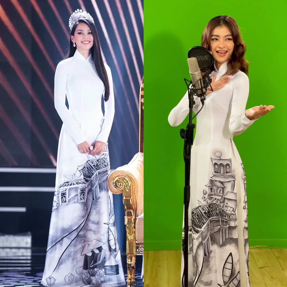 Nếu là fan ruột của làng nhan sắc, chắc chắn không thể bỏ lỡ chi tiết chùa cầu Hội An được khắc họa trên tà áo dài của cô nàng. Đây cũng là thiết kế mà Hoa hậu Tiểu Vy đã diện trong thời khắc chuyển giao nhiệm kỳ tại Hoa hậu Việt Nam 2020. Bởi cả hai đều là những người con xứ Quảng.