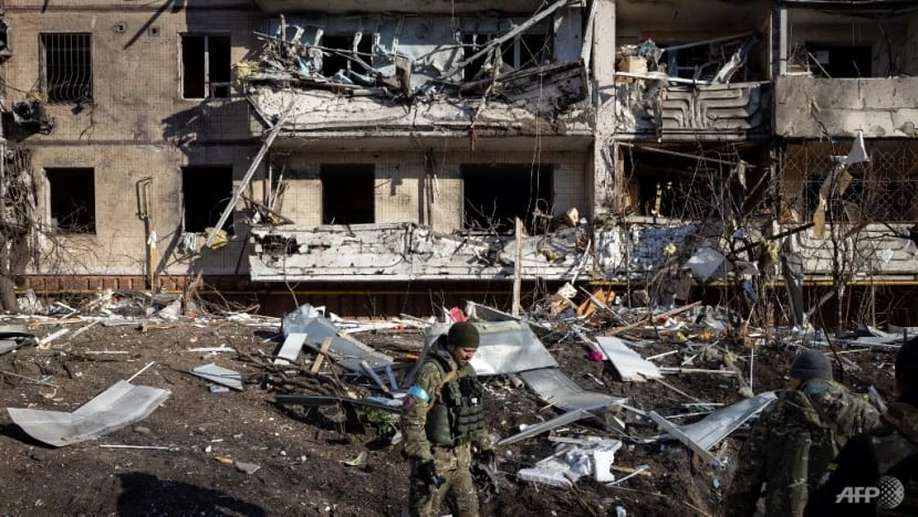 Một binh sĩ Ukraine kiểm tra đống đổ nát của một chung cư bị phá hủy ở Kiev vào ngày 15-3 sau khi Nga tấn công vào khu dân cư khiến ít nhất 2 người thiệt mạng. Ảnh: AFP