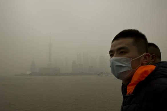 Một người đàn ông đeo mặt nạ trong khi đi bộ trên Bến Thượng Hải ở phía trước của khu tài chính của Phố Đông trong một ngày sương mù ở trung tâm thành phố Thượng Hải