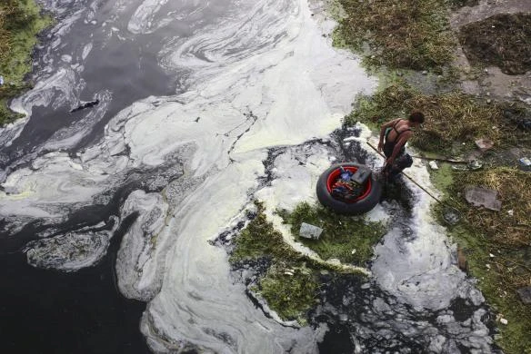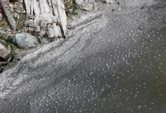 Bong bóng được nhìn thấy trong nước thải sinh hoạt trong một kênh nước ô nhiễm, chảy ra sông Wenyuhe, ở ngoại ô Bắc Kinh