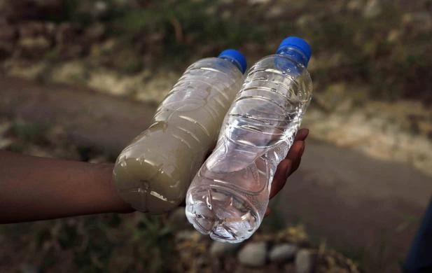 Hai chai nước, một từ một dòng suối bị ô nhiễm trắng, và nước khoáng bình thường khác, ở quận Dongchuan của Côn Minh, tỉnh Vân Nam