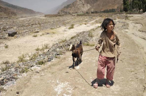Một cô bé dắt dê cạnh một nguồn nước ô nhiễm nơi mà cha mẹ cô đã đào một cái ao để lọc nước cho đất nông nghiệp của gia đình gần đó, tại thị trấn Lagu của quận Huize, tỉnh Vân Nam