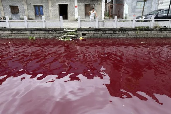 Một nhà báo lấy mẫu nước bị ô nhiễm đỏ trên sông Jianhe ở Lạc Dương, tỉnh Hà Nam