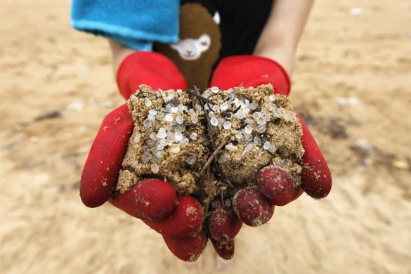 Cát bị lẫn với viên nhựa hút ẩm ở một bãi biển gần Hồng Kông