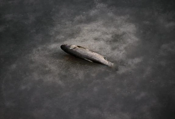 Con cá chết này bị sót lại trên mặt hồ đóng băng của một trang trại cá được xây dựng gần một nhà máy thép bị bỏ rơi của Tập đoàn thép Qingquan ở thị trấn Qianying, tỉnh Hà Bắc