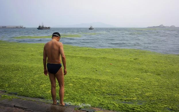 Đi bộ qua vùng bị tảo bao phủ bên bờ biển Thanh Đảo, tỉnh Sơn Đông,