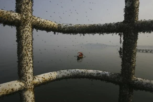 Muỗi, ruồi bu đầy ở lan can dọc theo hồ Đông ở Vũ Hán, tỉnh Hồ Bắc