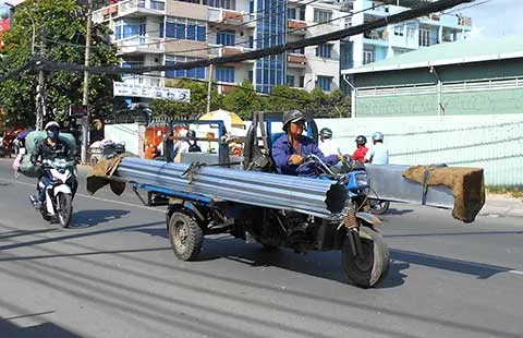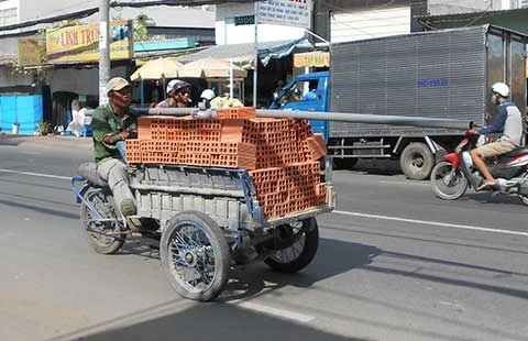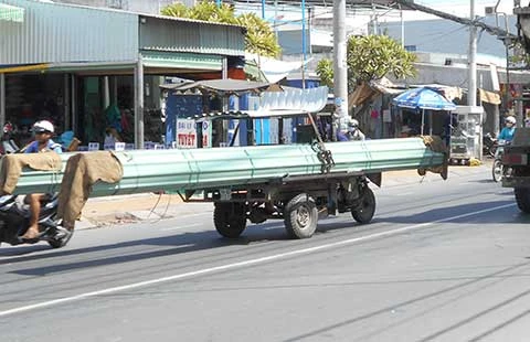 Lên xuống hàng bằng xe ba bánh tại một điểm kinh doanh vật liệu xây dựng mà lý ra chở những hàng này cần phải dùng xe tải chuyên dụng. Ảnh trong bài: MQ