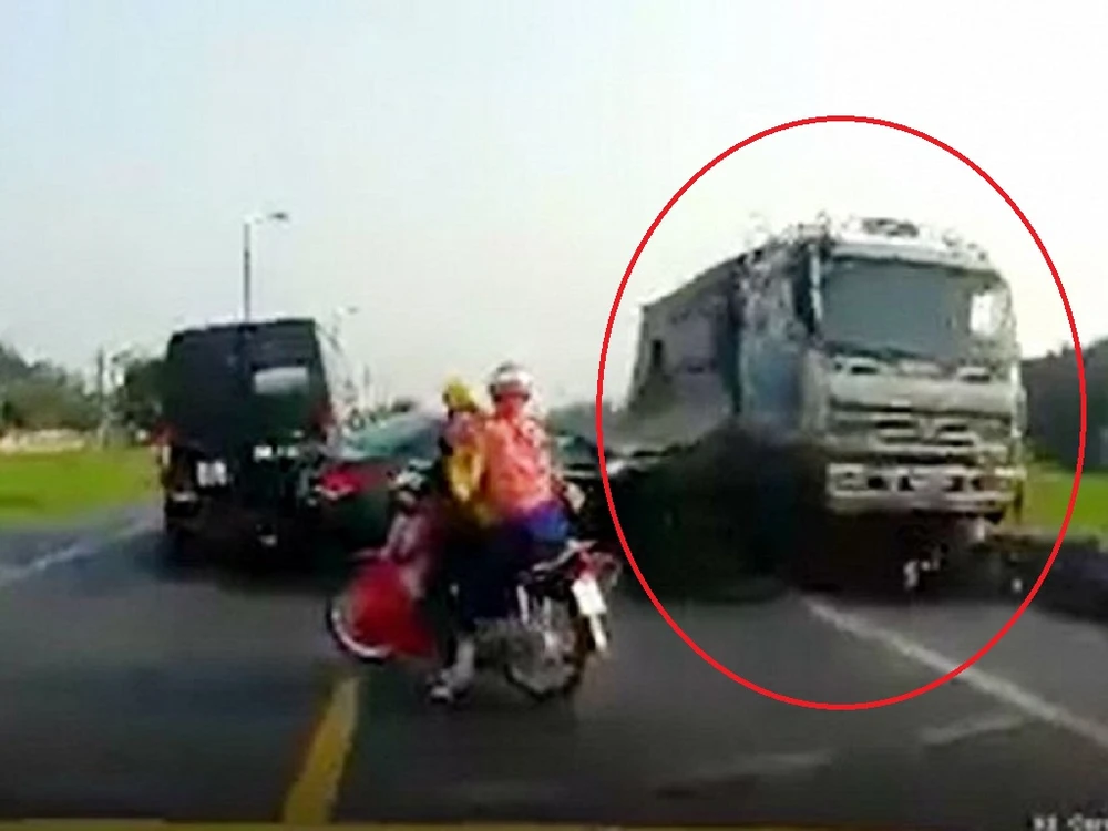 Xe tải chạy lấn làn tông chết hai người đi xe máy. (Ảnh cắt từ clip)