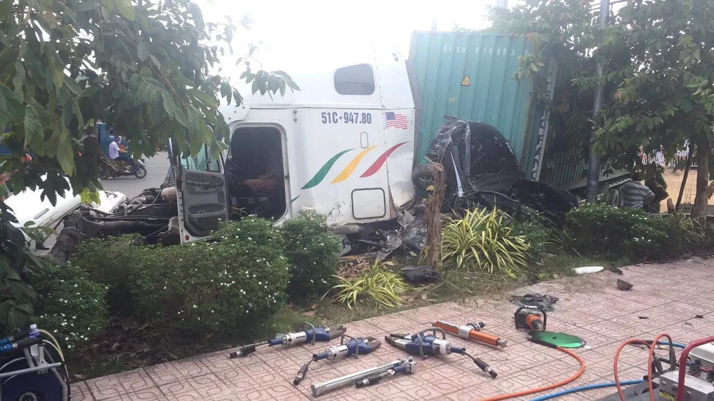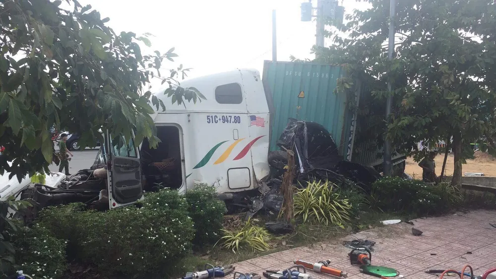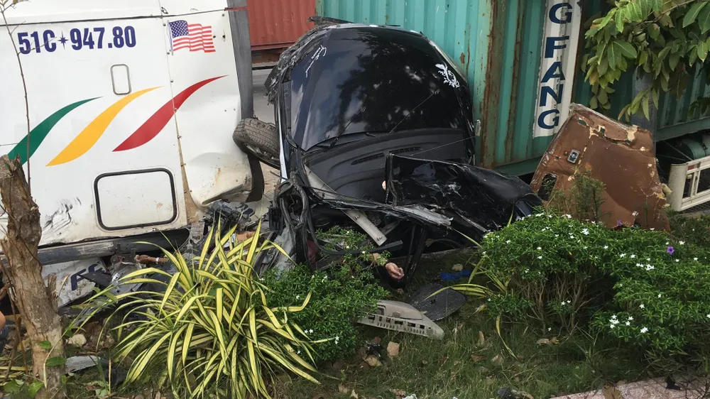 Tại hiện trường chiếc ô tô 4 chỗ bị biến dạng hoàn toàn, đầu xe container hư hỏng nặng; hai cột điện bị húc nghiêng.