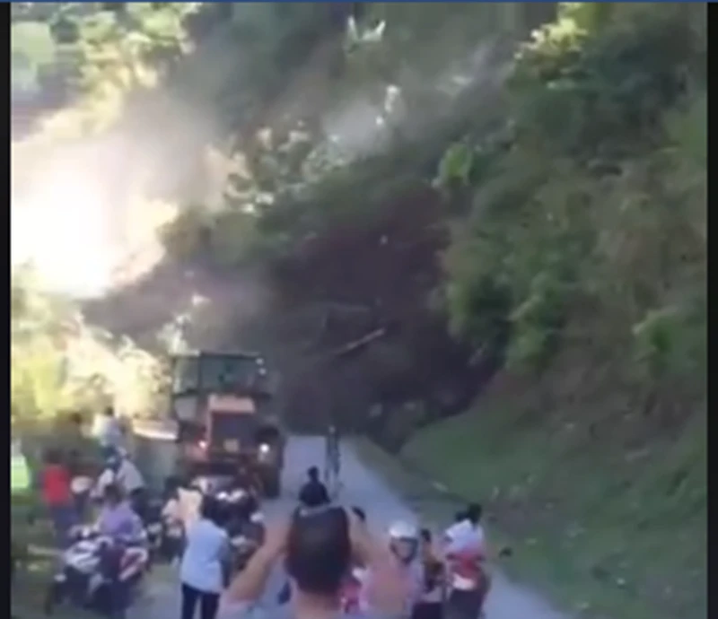 Chiều 4-9, mạng xã hội lan truyền clip khối đất đá ùn ùn ập xuống đường có nhiều người đang đứng.