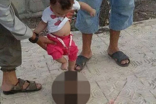 Trong bức ảnh, cha của đứa bé cười thích thú với “trò chơi” này khi hắn ta “khích lệ” con trai mình đá vào một cái đầu đã chặt đứt từ một binh sĩ Syria vừa bị hành quyết. Trong khi đứa bé này chỉ vừa mới đến tuổi biết đi.