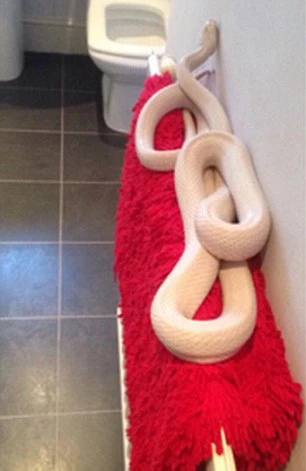Con rắn thông bạch tạng phía Bắc dài gần 2 mét được tìm thấy khi đang cuộn tròn trên tấm thảm đặt trên bộ tản nhiệt trong phòng tắm