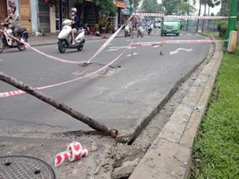 | Đường Hoàng Sa lại sụp lún Mới đây tại đường Hoàng Sa, phường 5, quận Tân Bình lại xuất hiện một điểm lún sụp, hư hỏng mặt đường. Theo khảo sát của các bên liên quan vào chiều 6-3, nguyên nhân là do một đoạn cống thu nước bên dưới (loại Ø600) bị hở mối nối khiến đất cát bị cuốn trôi, gây lún sụp. Vị trí hư hỏng được xác định thuộc gói thầu 7A, do liên danh nhà thầu trong nước thi công. |