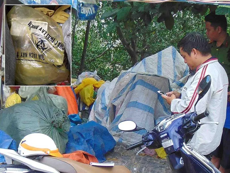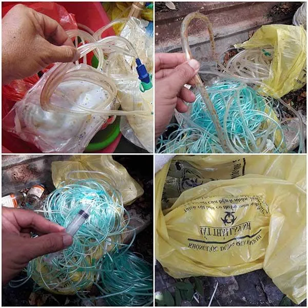 Mở một túi màu vàng, PV tá hỏa khi thấy trong đó chứa nhiều dây truyền dịch dính máu và cả những túi nhựa nhỏ màu trắng đựng dung dịch lỏng nhầy nhụa, bốc mùi… Một túi khác cạnh đó chứa rất nhiều bơm kim tiêm đã sử dụng, ống nhựa hỗ trợ đường thở còn dính máu…