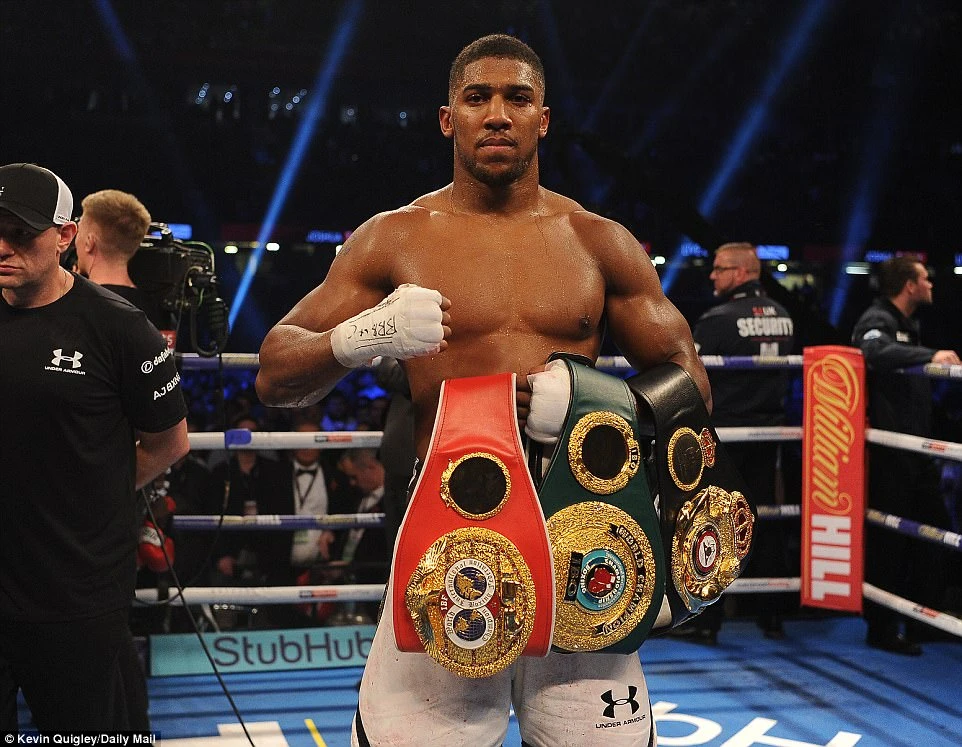 Joshua với ba đai vô địch hạng nặng IBF, WBA và IBO.