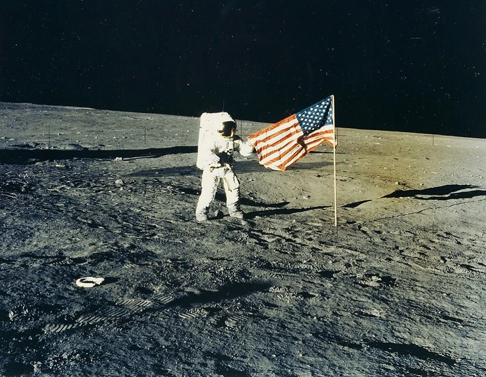 Phi hành gia Charles Conrad Jr cùng ngọn quốc kì Mỹ trên bề mặt Mặt Trăng năm 1969. Ảnh: NASA.