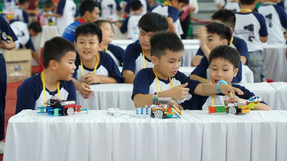 Các bạn nhỏ hào hứng lắp ráp mô hình robot để thi đấu