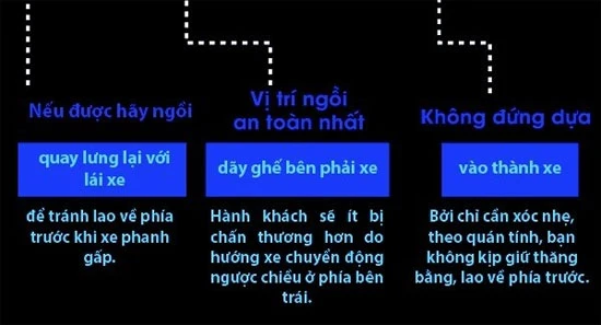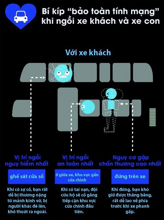 Còn vị trí ngồi nguy hiểm là ghế sát cửa sổ – khi có sự cố thì rất dễ bị những người khác đè lên, bị thương bởi các mảnh kính vỡ, và rất khó thoát ra ngoài. Đứng trên xe khách có nguy cơ chấn thương cao nhất Đứng trên xe khách có nguy cơ chấn thương cao nhất, vì khả năng giữ thăng bằng yếu, xe không có các điểm bám đặc biệt như trên xe buýt. Vì vậy, nếu thấy xe đã chật, thì tốt nhất nên đợi chuyến sau, không nên mạo hiểm.
