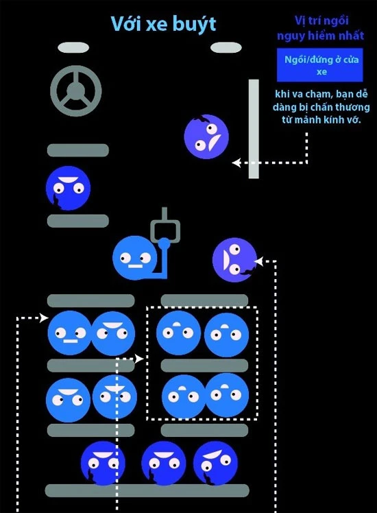 Khi bạn thường xuyên phải di chuyển bằng xe buýt, tốt nhất nên ngồi ở dãy ghế bên phải xe. Với chiều chuyển động giao thông như ở nước ta thì hướng xe chuyển động ngược chiều sẽ ở phía bên trái xe, nên những hành khách ngồi phía phải sẽ có nguy cơ chấn thương ít hơn. Khu vực nguy hiểm nhất trong xe buýt chính là cửa xe Nếu có khả năng thì hãy ngồi quay lưng lại lái xe để tránh lao về trước khi xe phanh gấp.