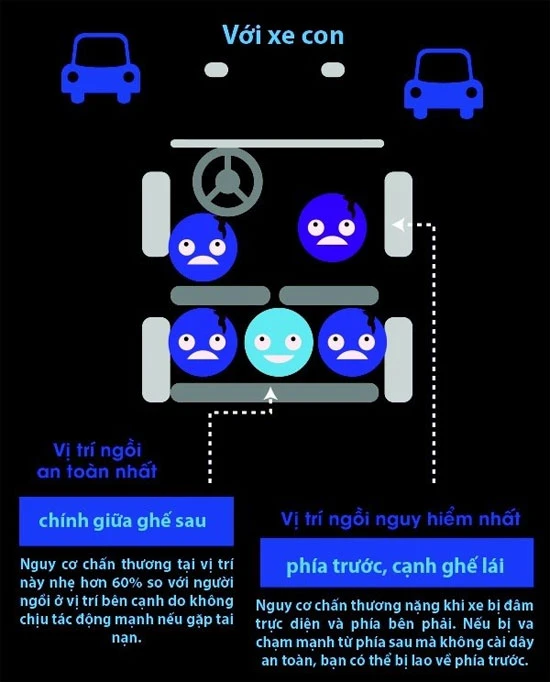 ơng nhẹ hơn đến 60% so với các hành khách còn lại. Ngoài ra, chỉ thật cần thiết mới ngồi phía trước cạnh ghế lái. Vị trí an toàn nhất trên xe con là phía sau ghế lái, tốt nhất là ở giữa