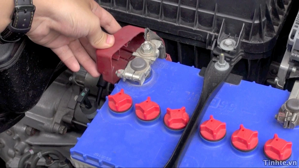 Đặt kẹp dây cáp cực dương vào cực điện dương và tương tự nối kẹp dây cáp âm vào cực âm. Sau đó đậy nắp ắc qui và khởi động xe.