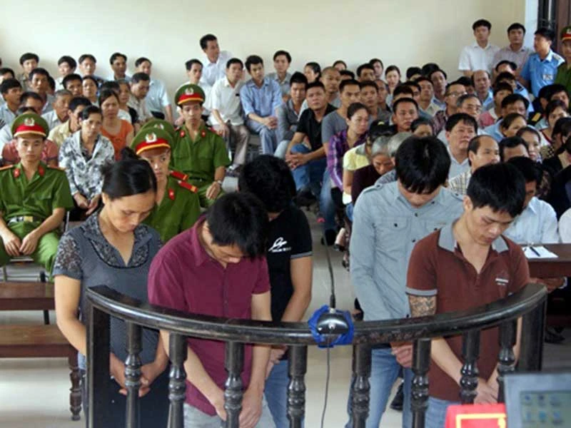 Các bị cáo tại phiên tòa sơ thẩm (Hiển hàng đầu bên trái, Biên hàng đầu bên phải). Ảnh: INTERNET