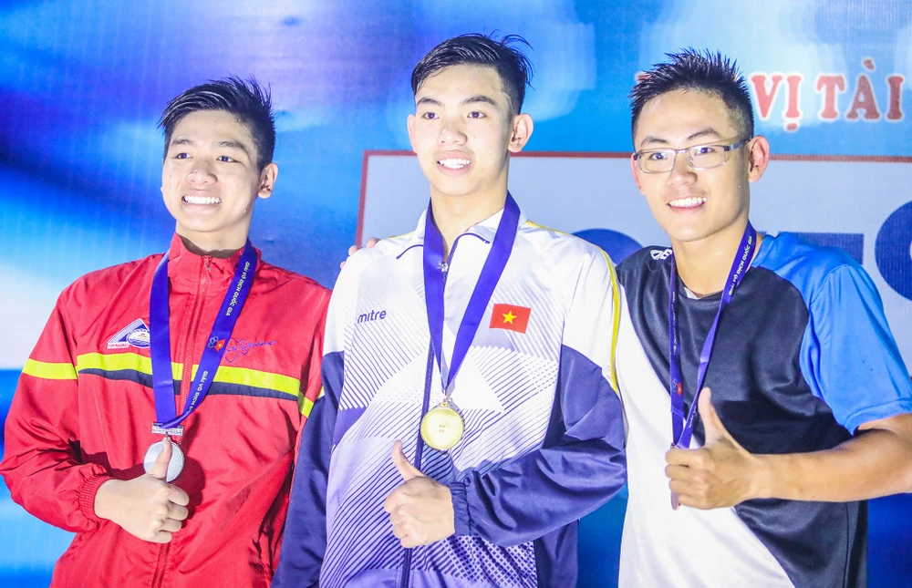 Kim Sơn, Huy Hoàng và Lâm Quang Nhật nhận huy chương cự ly 400 m hỗn hợp nam. ẢNH: PHẠM HUY