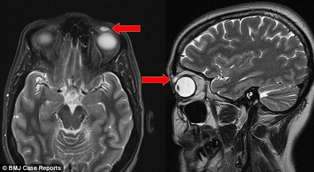 Bản chụp MRI cho thấy trên mí mắt bệnh nhân có một nốt nhỏ, kích thước 8mm x 4mm x 6mm, ban đầu bác sĩ cho rằng chỉ là mụn bọc. Tuy nhiên, khi lấy dị vật ra, các bác sĩ phẫu thuật vô cùng kinh ngạc khi phát hiện ra khối u này thực sự là một cái kính sát tròng đã rạn vỡ.