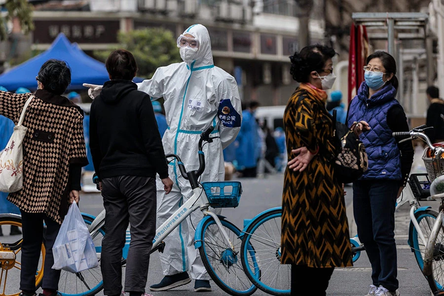Nhân viên y tế Trung Quốc tại một chốt kiểm soát ở TP Thượng Hải ngày 2-4. Ảnh: SCMP
