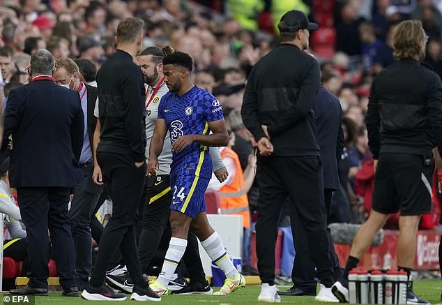 Reece James nhận thẻ đỏ rời sân. ẢNH: EPA