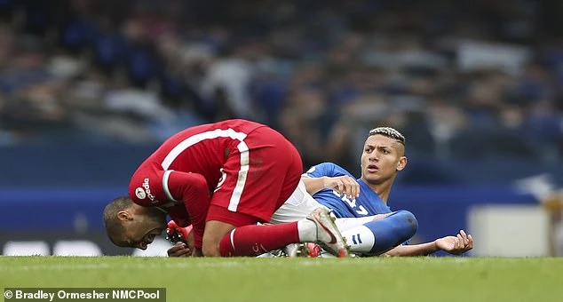 Thiago Alcantara dính chấn thương sau pha vào bóng của Richarlison. ẢNH: NMC POOL