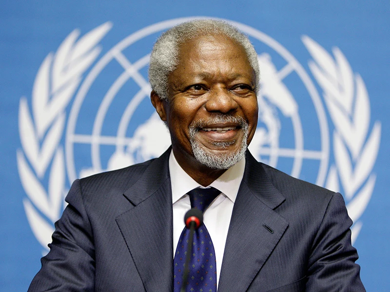 Sinh ngày 8-4-1938, ông Kofi Atta Annan, nhà ngoại giao đến từ Ghana ở Tây Phi, là viên chức Liên Hiệp Quốc (LHQ) đầu tiên trong lịch sử được giữ trách nhiệm tổng thư ký. Ông là tổng thư ký LHQ thứ bảy, giai đoạn 1997-2006. LHQ và ông từng được trao giải Nobel Hòa bình năm 2001 vì những cống hiến cho một thế giới tổ chức tốt hơn và hòa bình hơn. Khi còn tại nhiệm, ông đã ưu tiên thành lập một chương trình cải cách toàn diện nhằm vực dậy LHQ. LHQ có truyền thống thúc đẩy sự phát triển của thế giới và ông đã đóng góp không nhỏ cho công cuộc vĩ đại này.