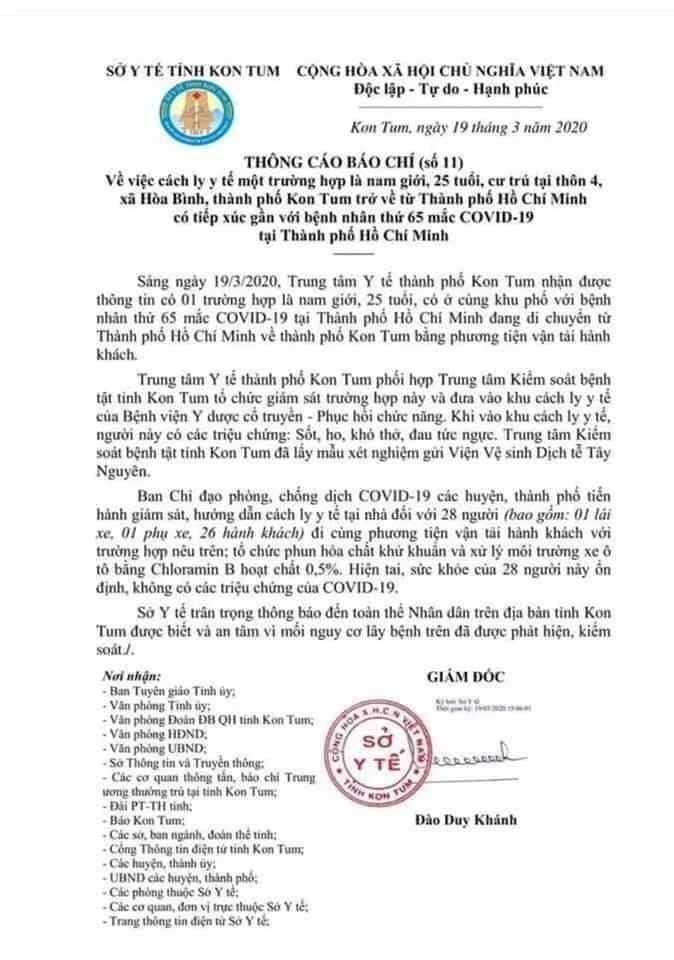 Chiều 19-3, Sở Y tế Kon Tum cho biết đã cách ly y tế một trường hợp là nam giới, 25 tuổi, cư trú tại TP Kon Tum (tỉnh Kon Tum) trở về từ TP.HCM.