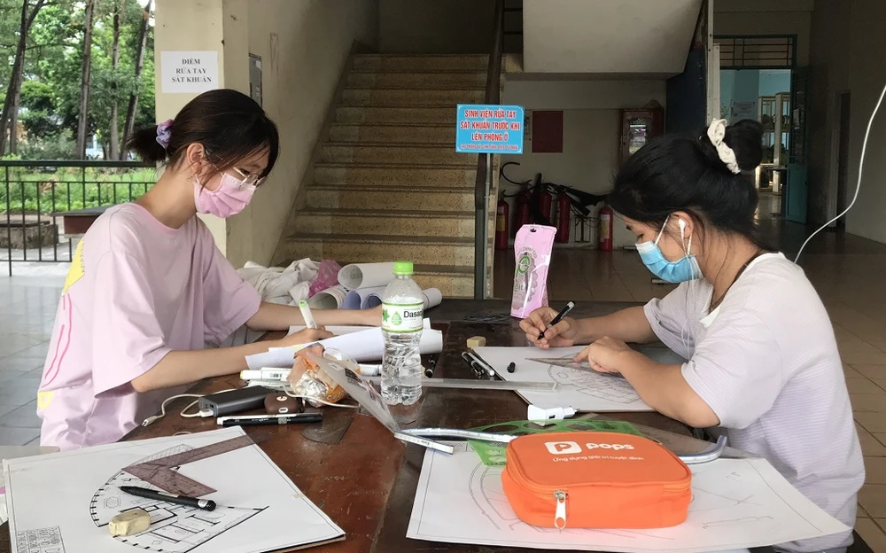 "Nếu về nhà lúc này sẽ không tiện cho việc học của tôi. Tôi sẽ ở lại để làm bài và bảo vệ bản thân mình, tránh đi vào trung tâm thành phố", cô tâm sự. Trong lúc làm bài tập nhóm ở phòng tự học của KTX, Vy và bạn của mình cũng đeo khẩu trang để đảm bảo an toàn.