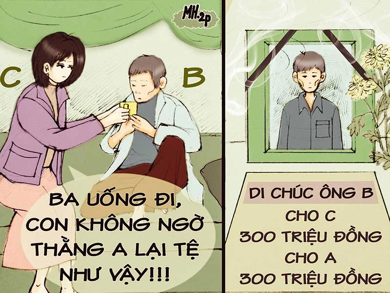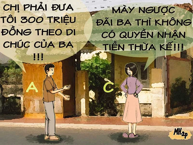 Thay vì hiếu thảo, phụng dưỡng ba mình, A lại thường xuyên có hành vi ngược đãi. Trong một lần bất ngờ đến thăm ba, chị C đã tận mắt chứng kiến việc A xô ngã ông B nên lập tức đưa ba về ở với vợ chồng mình để chăm sóc và không nhìn mặt đứa em bất hiếu. Trong suốt cuộc đời, ông B đã tích góp được 600 triệu đồng gửi tiết kiệm. Trước khi mất, ông B đã để lại di chúc chia cho hai chị em mỗi người 300 triệu đồng. Ông B nằm xuống chưa yên thì A biết việc liền tìm đến gặp chị C yêu cầu thực hiện di chúc: “Chị phải đưa tôi 300 triệu đồng theo di chúc của ba”. Giận đứa em bất hiếu, không đáng được thừa hưởng di sản, chị C nhất quyết không đồng ý: “Mày ngược đãi ba thì không có quyền nhận thừa kế”. Hai bên tranh cãi, không ai nhường ai.