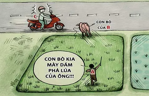 Tình huống kỳ 8: Vào một ngày đẹp trời, B cột bò ăn cỏ trên đất của mình. Không ngờ dây cột bị đứt, bò của B chạy sang ruộng của A kế bên ăn lúa. Trước đó, do bò của B cũng đã sang ăn và phá lúa nhiều lần nên lần này thấy bò của B lại sang ăn lúa, A đã nổi đóa, cầm cây rượt đánh bò của B tới tấp. Hoảng sợ, bò của B chạy thẳng ra quốc lộ ở cạnh đó. Không may cho C đang lái xe máy trên đường cùng vào thời điểm này. Do bất ngờ, C đã không kịp tránh và tông thẳng vào con bò. Cú tông làm C té ngã, chiếc xe máy bị hư hỏng nặng. Lúc này B biết việc nên cũng vừa chạy tới. Trước tai nạn từ… dưới ruộng chạy lên, C yêu cầu A và B phải bồi thường cho mình. A thì dứt khoát không chịu vì đây là bò của B. Ngược lại, B đổ lỗi do A rượt đánh nên bò mới chạy lên quốc lộ gây ra tai nạn.