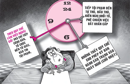 Cụ thể, theo Quyết định số 59 ngày 6-2-2006 của viện trưởng VKSND Tối cao (về việc ban hành quy chế tiếp công dân, giải quyết khiếu nại tố cáo… của VKS), việc tiếp công dân tại VKS được thực hiện 24/24 giờ trong ngày. Ngoài giờ làm việc hành chính, VKS các cấp chỉ tiếp công dân, cơ quan, tổ chức đến tố giác, báo tin về tội phạm hoặc kiến nghị khởi tố, tiếp người phạm tội đến tự thú, đầu thú. Viện trưởng VKS các cấp có trách nhiệm tổ chức việc tiếp công dân ngoài giờ hành chính (kể cả ngày nghỉ, ngày lễ) theo ca trực nghiệp vụ…