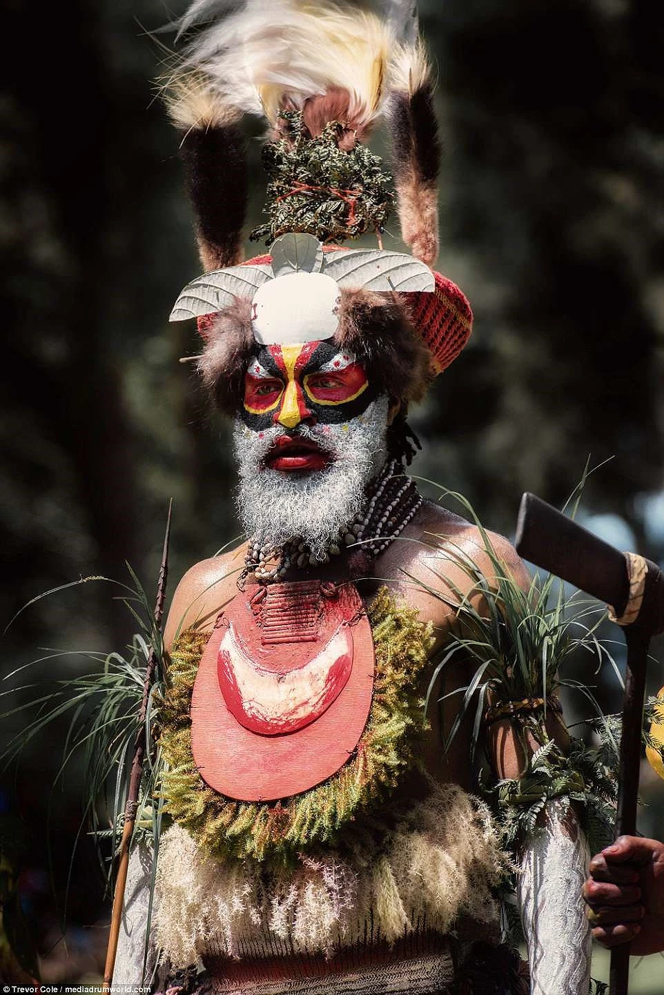 Một người đàn ông bộ lạc Huli đầu đội mũ lông chim, mặt sơn vẽ và đeo nhiều vòng hạt trang trí. Đây là hình ảnh quen thuộc trước khi lên đường săn bắn của thanh niên trong bộ lạc. Ảnh: Trevor Cole