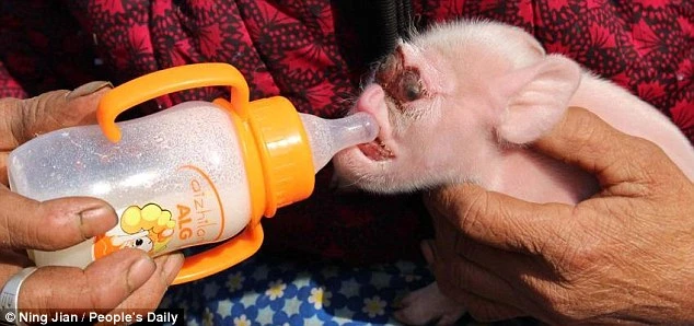 Thay vì bú sữa trực tiếp như những con lợn khác, chủ của nó phải cho nó bú bình.