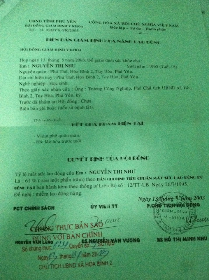 Liên lạc với phòng Công tác Học sinh sinh viên trường ĐH Phú Yên, chúng tôi được thông tin bạn Nguyễn Thị Như hiện là sinh viên năm tư của trường. Hồ sơ nhập học của Như cũng thể hiện Như bị lão hóa và tỉ lệ mất sức lao động do bệnh tật là 61%.